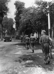 Pasukan Belanda merangsek maju di ruas jalan di salah-satu kota di Sumatera, 4 Januari 1949, dalam operasi menumpas pasukan Republik Indonesia.