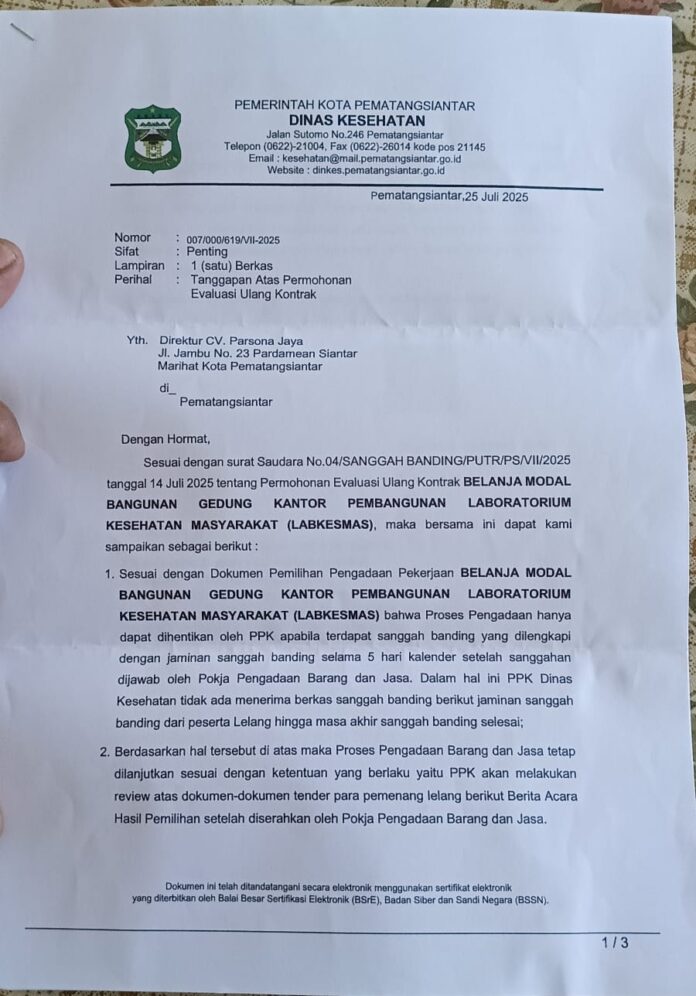 diberitakan, salah satu perusahaan penyedia jasa konstruksi CV Parsona Jaya telah melaporkan Panitia tender proyek (pokja) pembangunan Laboratorium Kesehatan Masyarakat (Labkesmas) dengan pagu anggaran sebesar Rp7,85 miliar di Kota Pematangsiantar atas dugaan penyimpangan prosedur dalam proses evaluasi dan penetapan pemenang tender. Senin (21/7/2025).