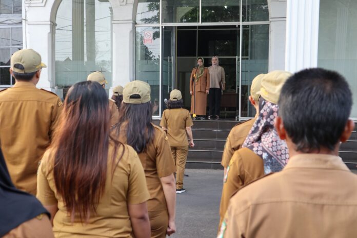 RROL.ID, Pematangsiantar – Wali Kota Pematangsiantar dr Susanti Dewayani SpA memimpin apel pagi terakhir bersama pegawai di Pemerintah Kota (Pemko) Pematangsiantar di Balai Kota Pematangsiantar, Jalan Merdeka, Senin (17/02/2025).
