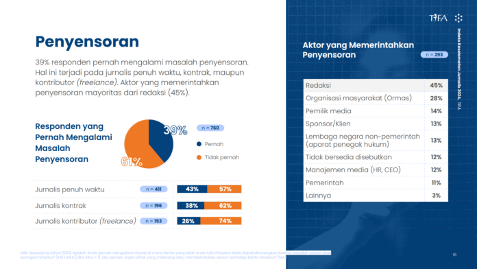 Manajer Riset Sosial Populix, Nazmi Haddyat, menjabarkan bahwa dari 760 jurnalis aktif yang menjadi responden survei, 39% persen pernah mengalami penyensoran berita.