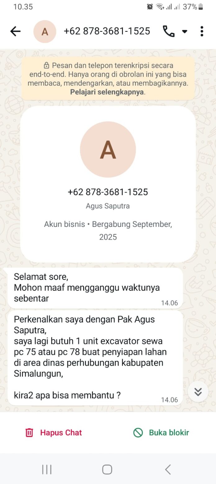 Dalam komunikasinya ia menyampaikan melalui whatsapp “Perkenalkan saya dengan Pak Agus Saputra, saya lagi butuh 1 unit excavator sewa pc 75 atau pc 78 buat penyiapan lahan di area Dinas Perhubungan Kabupaten Simalungun. kira-kira apa bisa dibantu?”.