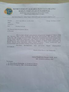 Pertemuan tersebut sesuai dengan surat Badan Pertanahaan Nasional Kabupaten Toba Jalan Somba Debata No 3 Balige Nomor : IP.01.02/195-12.12/III/2024 hal pemberitahuan tanggal 8 Maret 2024, terkait permohonan pengukuran tanggal 7 Maret 2024 oleh pemohon Mula Horas Nadadap dan surat keberatan Kardi Nadadap tanggal 8 Maret 2024 untuk melakukan pra-survei/pengecekan bidang tanah milik Oppu Raja Nadadap tersebut.