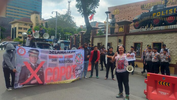 RROL. ID, Jakarta – Dinilai narkoba marak di Sumut, Aliansi Mahasiswa Sumatera Utara Bersatu gelar aksi demonstrasi di Markas Besar Kepolisian Republik Indonesia, Jalan Trunojoyo, Jakarta Selatan. Kamis, (21/3/2023)