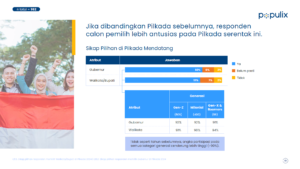 Dari hasil penelitian Populix, 91% responden mengaku akan berpartisipasi dalam pemilihan walikota/bupati, dan 92% akan menggunakan hak suaranya pada pemilihan gubernur. Sekitar 6% responden mengaku masih belum pasti memilih, sedangkan hanya 2% yang mengaku akan golput.