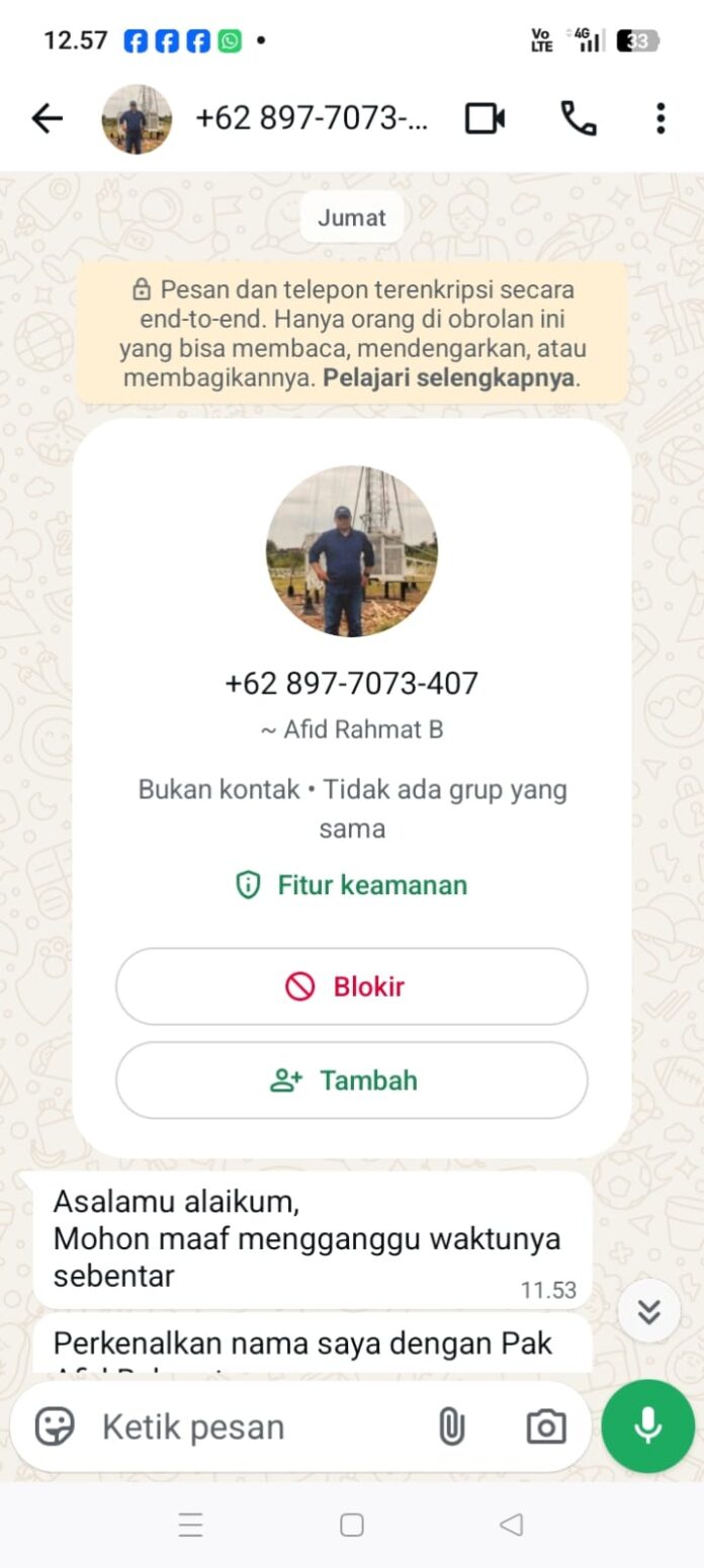 RROL.ID, Pematangsiantar – Ternyata Modus penipuan menyewa atau rental alat berat dan peralatan untuk proyek sudah beberapa kali hampir memakan korban. salah satunya yang hampir menjadi korban adalah CV Nusa Bahagia Konstruksi dihubungi oleh akun Whatsapp diduga Afid Rahmad B melalui celular Whatsapp nomor 08977073407.